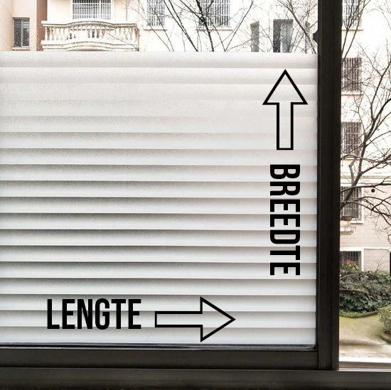 Raamfolie met gestreepte lijnen. Dit raamfolie is ideaal tegen directe inkijk en is tevens perfecte decoratie! Het raamfolie met plaklaag plakt eenvoudig op gladde en vetvrije ramen en glazen. Het glasfolie schermt af, maar laat wel licht door. Het folie heeft een breedte van circa 90 centimeter. De lengte mag je zelf kiezen. Vanwege de breedte van dit folie geldt er een toeslag in de verzendkosten van € 2,-.